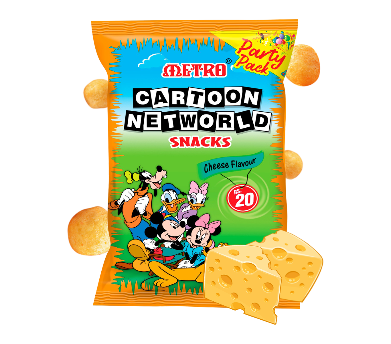 Metro Cartoon Networld Cheese is a fun and tasty snack made with corn grits, infused with savory Cheese flavor, and cooked in vegetable oil. Perfect for a flavorful and crunchy treat that everyone will enjoy!
